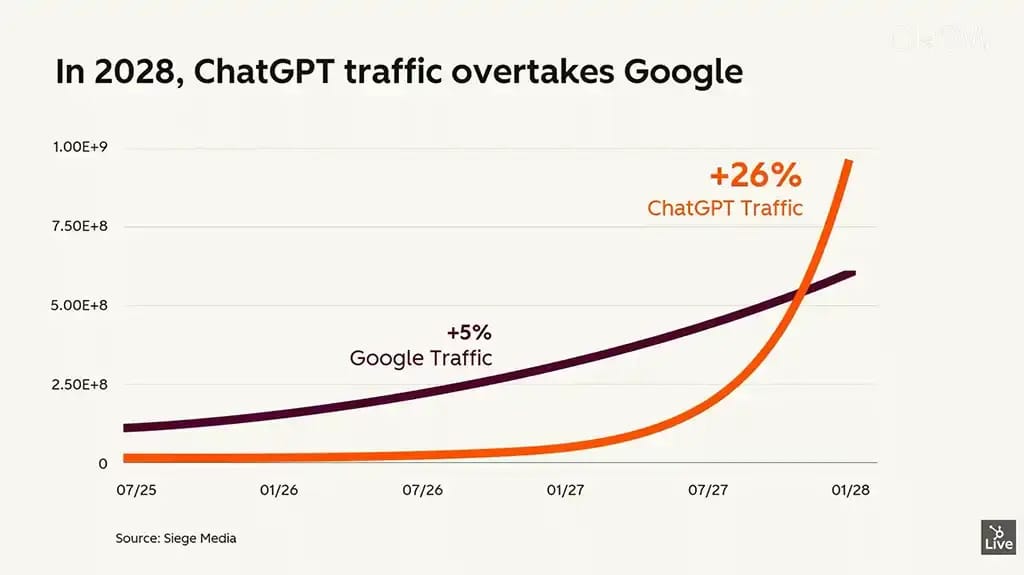 D’après les tendances actuelles, les plateformes d’IA générative pourraient générer davantage de visites vers les sites web que les moteurs de recherche traditionnels d’ici trois ans. En clair, d’ici 2028, ChatGPT et autres moteurs IA pourraient détrôner Google en tant que première source de trafic de recherche. HubSpot évoque même que ChatGPT deviendrait la source majoritaire de « answer engine traffic » vers 2028. Cela représente un changement tectonique dans l’acquisition de trafic : Google, l’« overlord » incontesté des 20 dernières années, ne serait plus numéro un. Ce n’est pas une simple mise à jour d’algorithme, mais un basculement fondamental de la façon dont les internautes trouvent l’information, avec des implications majeures pour le marketing de la demande.